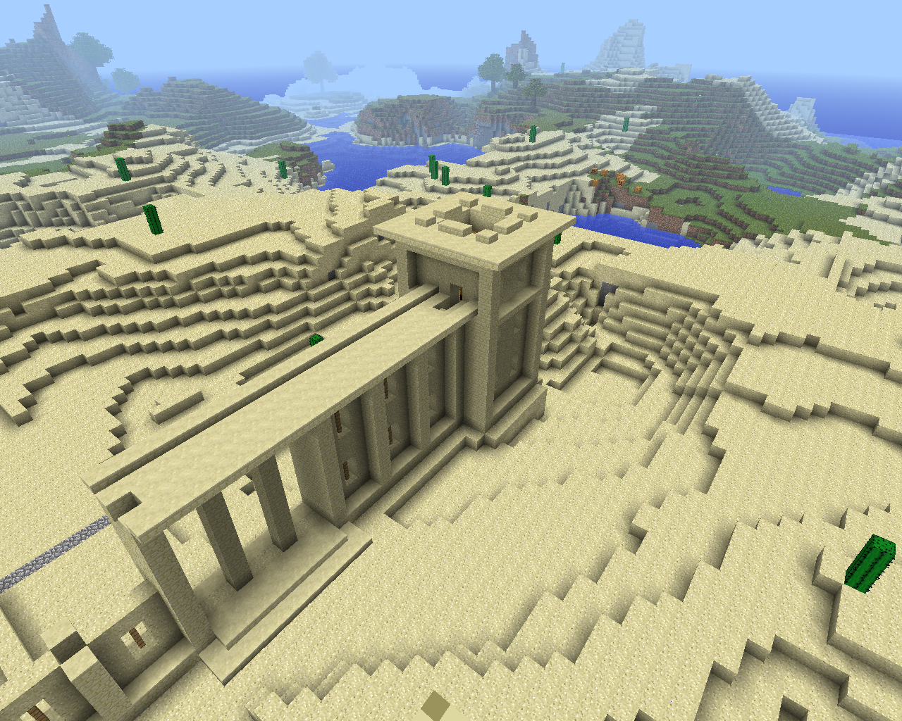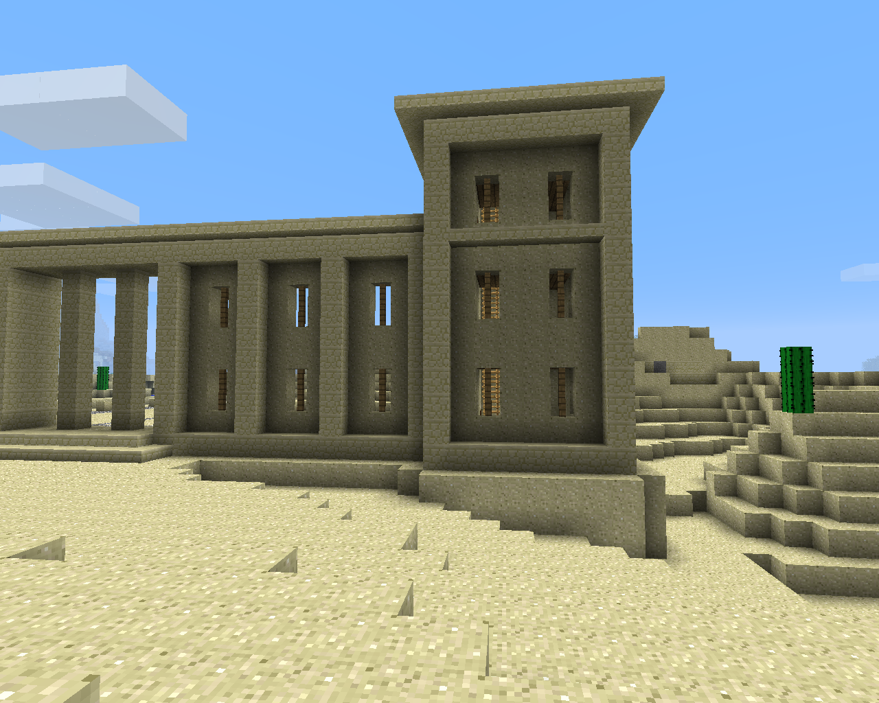 Afin de créer un contraste satisfaisant j'ai "rusé" en utilisant non seulement de la sandstone, mais aussi du sable tout simple (piliers et armatures en sandstone, mur plat en sable.