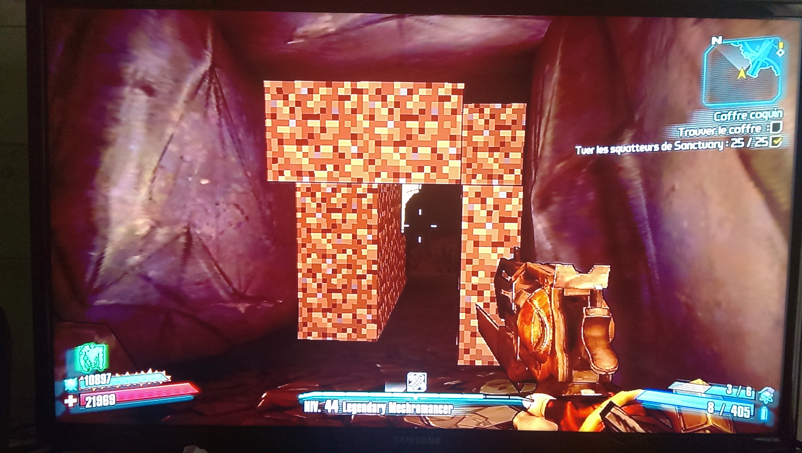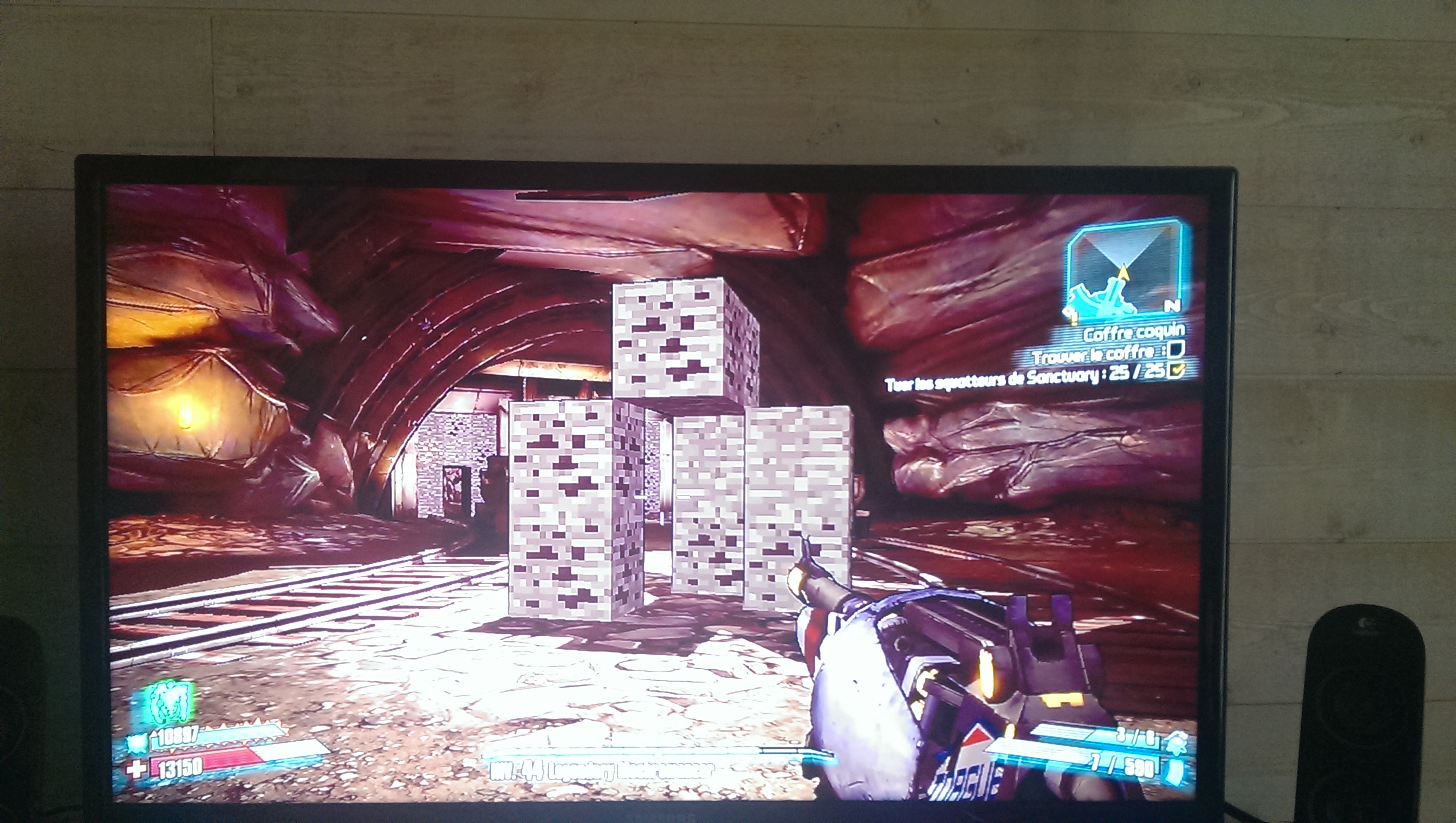 Aujourd'hui en me promenant dans Borderlands 2 je suis tombé sur une découverte plutôt amusante : Des bloc de dirt minecraft en les cassant je suis tombé sur de la stone avec du charbon ( qui donne des munitions ) et de l'or ( qui donne...de l'argent ! )
